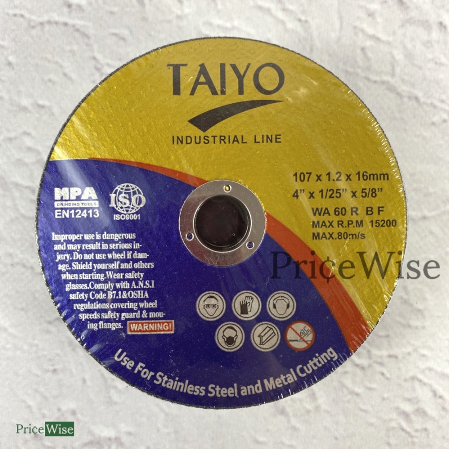 Merk: TaiyoUkuran: 4 inch x 1/25 inch x 5/8 inch (107mm x 1.2mm x 16mm)Jumlah: 1 buahWA 60 R B FMaks kecepatan 15.200 RPMMaks 80 m/sUntuk besi dan stainlessUntuk pembelian 1 wadah (isi 50 buah + wadah): https://shopee.co.id/Mata-Batu-Gerinda-Potong-4-x1.2mm-50pcs-Taiyo-Grinding-Wheel-Gurinda-i.294727870.56704