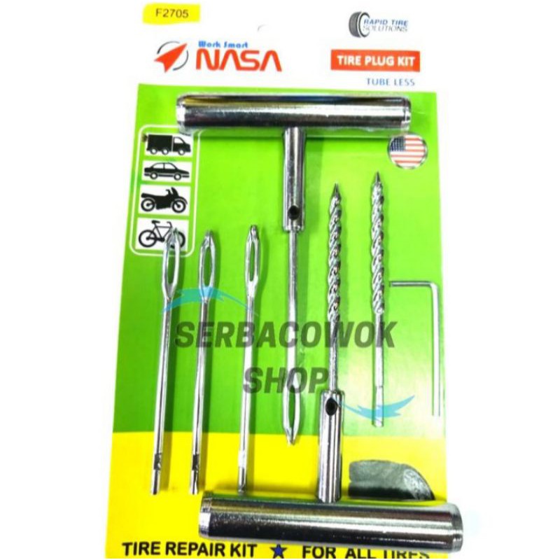 Promo Terbatas Alat Gagang Tambal Ban Tubeless Tubles Set Besi Motor-Mobil Toolskit Original Termurah BerkualitasAlat tambal ban Ori Nasa, terpercaya akan kwalitas handle serta jarumnya, Pegangan jarum pengait dan pegangan kikir terbuat dari bahan stainles dan anti karat,anti slek.dgn bentuk yg pas di genggaman tangan.berguna utk:Tambal ban permanen,Tambal ban darurat quality, Tanpa khawatir ban bocor dimana pun,persiap kan alat ini di setiap kendaraan anda.Khusus utk ban tubles ( sepeda,motor ,mobil)Dlm pemakaian sendiri, sangat membantu dlm penghematan biaya,Karna cara pemakaian yg sangat mudah,cepat, dan praktis.Kelengkapan 1 set alat repair kit :- 1 stang pengait- 1 stang pengikir- 4 jarum pengait (1 terpasang)- 2 pengikir atau bor (1 terpasang)- 1 ku