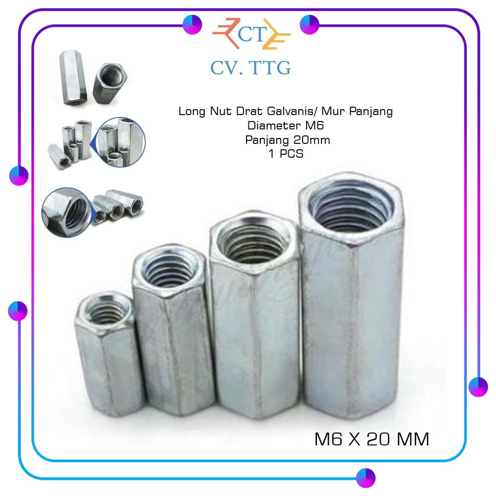 Long Nut Drat Galvanis/ Mur Panjang M6 X 20mmMur Panjang / Long Nut 6 mmMur bisa untuk Longdrat ukuran 6 mmPanjang 20 mmDiameter 6 mmHarga Per P