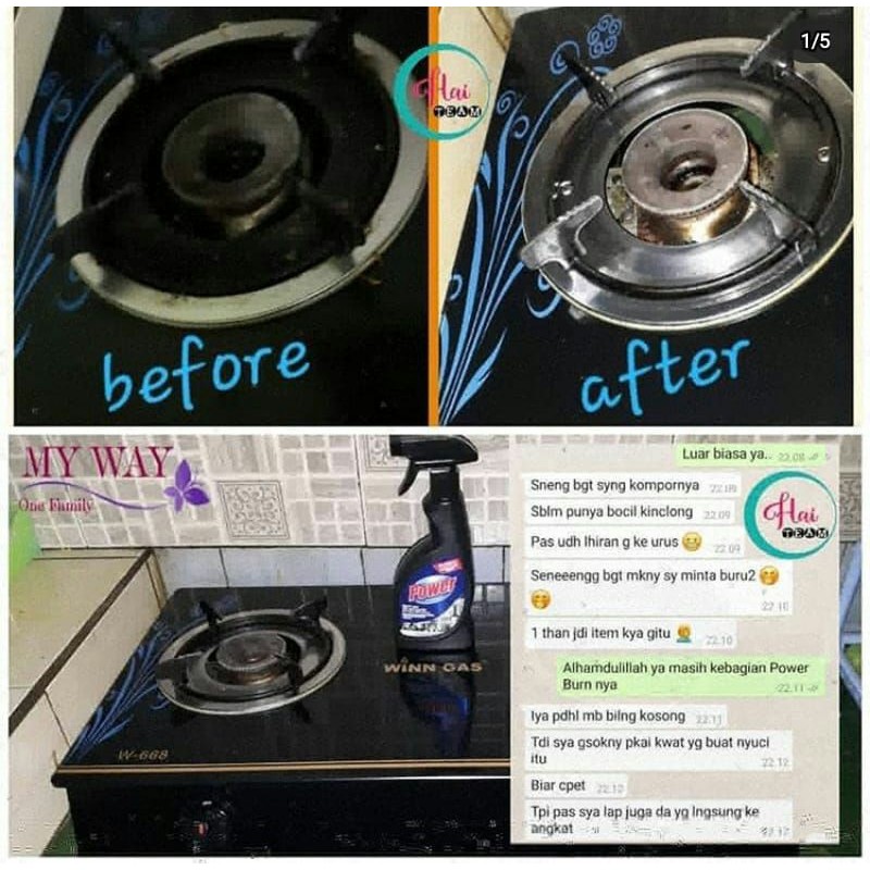 POWER HITAM /POWER BLACK Kegunaan:• Membersihkan kerak panci• Membersihkan kerak Kompor• Membersihkan kerak setrika• Menghilangkan lemak yang menempel pada peralatan dapur / kitchen set / cooker hood• Membersihkan peralatan dari logam• Membersihkan bak cuci piring Cara pakai:• Semprot banyak pada area berkerak/berlemak• Apabila kerak tebal pancinya dipanaskan dahulu sampai benar2 panas lalu disemprot power• Lap dengan kain bersih/tissue dapur/bilas• ULANGI beberapa kali sampai mendapatkan hasil yang diinginkan Note:Untuk kerak panci yang sudah menahun dan item banget butuh beberapa kali proses ya kakak2 cantik. Karena ini bahan pembersihnya bukan bahan kimia yang keras. Kalau keras tidak aman untuk peralatan masak. Setelah kerak rontok tinggal perawatan semprot satu dua kali saja sudah luntur lemak2nya. POWER MERAH 7 IN 1/POWER RED Membersihkan noda2 pada kain/baju. Noda lipstick, pulpen, kopi, darah, karat dllCara pakai:Semprotkan pada kain yang bernoda, kucek dan bilas. Bisa juga untuk membersihkan kerah baju Isi:Power Hitam 500mlPower Merah 50