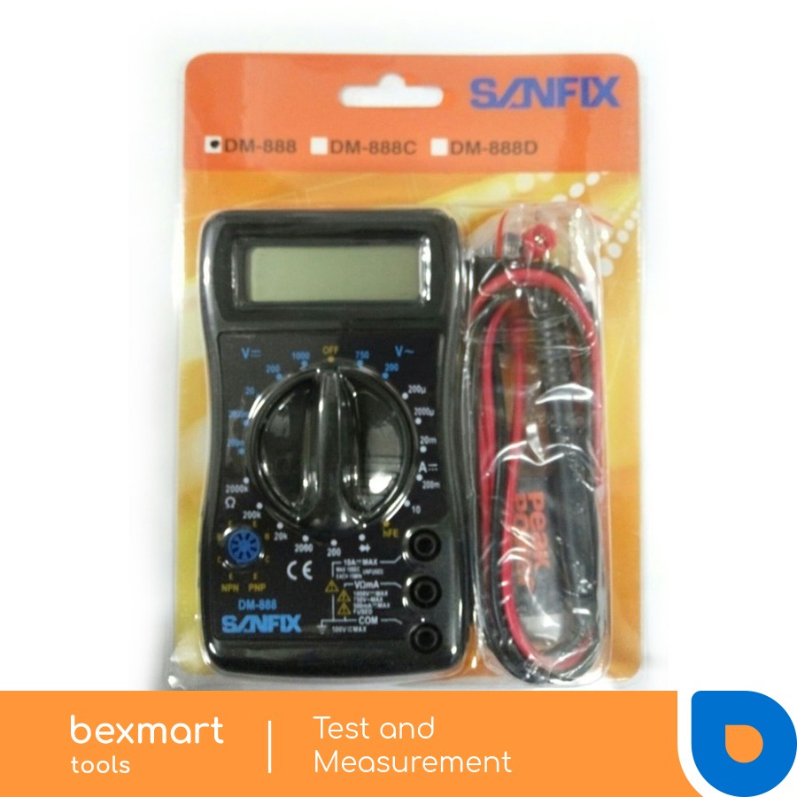 Multitester Multimeter Sanfix DM-888Brand: Sanfix Made in TaiwanSpecs:- DCV : 200mV-2000mV-20V-200V-1000V -/+0,8%- ACV : 200V-750V -/+1,5%- DCA : 200mA -10A -/+ 1,2%- Ohm : 200Ohm, 2000Ohm, 20KOhm, 200KOhm, 2000KOhm 1%- Transistor : PNP & NPN- Diode : YesPaket sudah termasuk kabel tester & bat 9vBerat 150gramSize 12,6 x 7 x 2