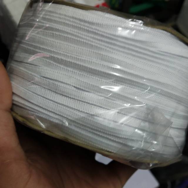Tali karet gepeng ukuran 4mm biasa digunakan untuk tali masker, panjang 1roll 100metersilakan langsung diorder, selama iklan ada berarti stok ters